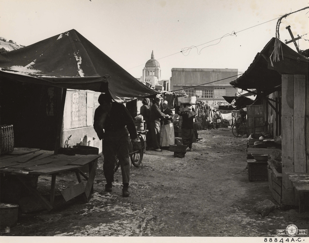 “Korea, 18 months after official Armistice — A street scene a few blocks off the main street, Seoul, Korea. 18 December 1954.”