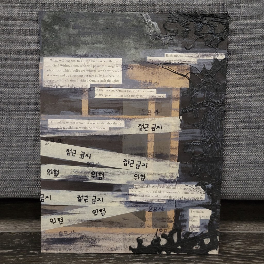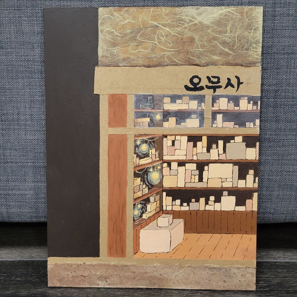 Laura Rossi produced a series of paintings based on her interpretation of Hwang Jung-eun’s novel One Hundred Shadows (2016) translated by Jung Yewon. The novel deals in part with the demolition of a building that houses small businesses, one of which is named Omusa. Laura produced two canvases “with one side being the warm and inviting image of Omusa’s and the other being the empty shop about to be demolished and turned into the new park.” From 01:574:392 Everyday Life in the Neoliberal City at Rutgers Ewha Study Abroad (RESA), Spring 2023.